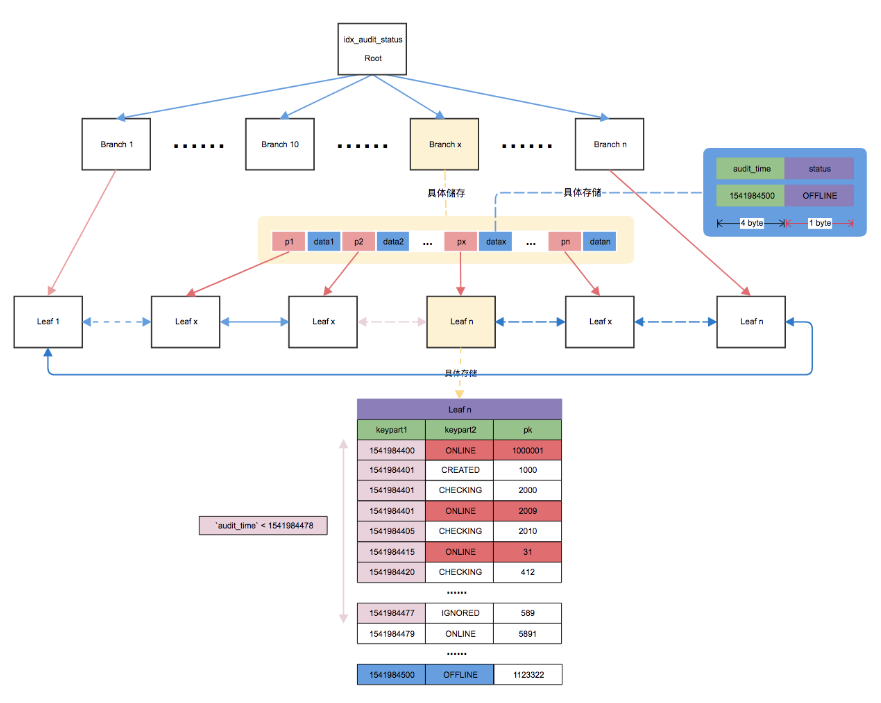 < audit_time是一个范围查找,而第二列索引的值是分散的。所以需要依次往前查找,匹配出满足条件(status='ONLINE')的索引行,直到取到第5行为止。 - 回表查询需要的具体数据