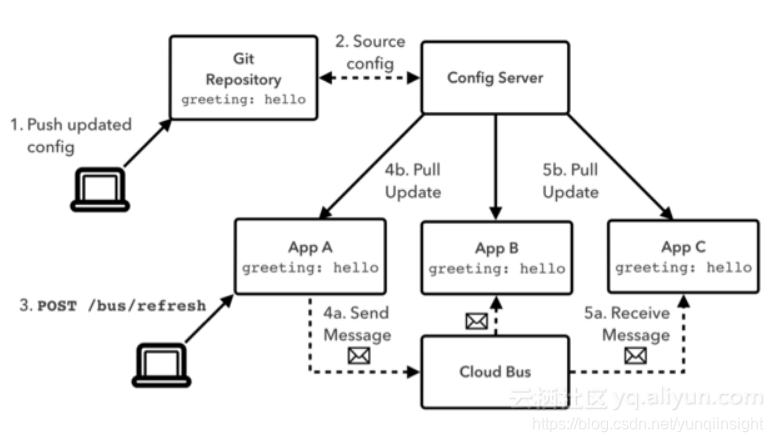 - 所有其他机器通过消息总线获知配置刷新后,在Config Server中拉取最新配置。