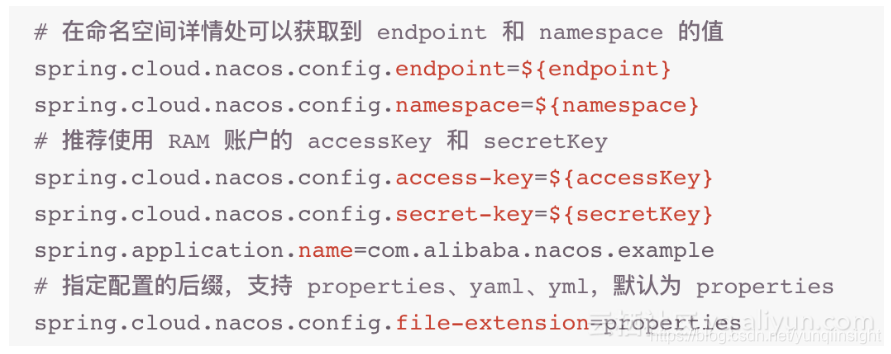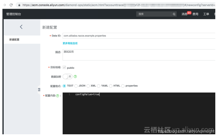 指定spring.application.name和spring.coud.nacos.config.file以后,将决定ACM控制台上配置名,如上例中,配置名为com.alibaba.nacos.example.properties。