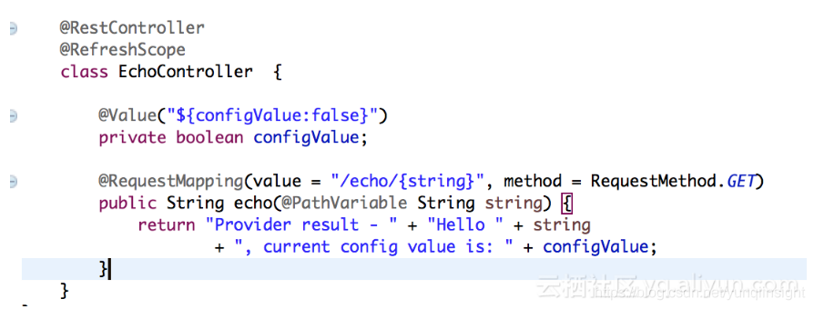 Spring Cloud 代码和配置变更实例以Spring Cloud代码示例为例,/echo 接口将返回动态配置参数 configValue 的值。