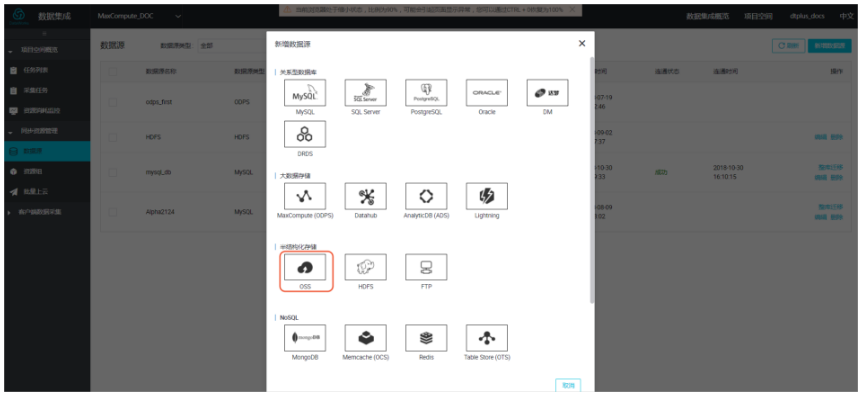 进入DataWorks数据集成控制台,新增OSS类型数据源。