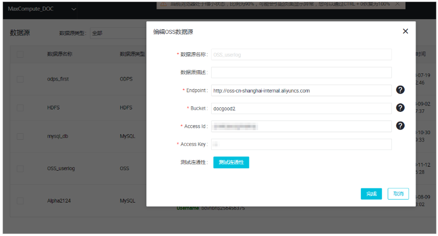 具体参数如下所示,测试数据源连通性通过即可点击完成。Endpoint地址请参见OSS各区域的外网、内网地址,本例中为http://oss-cn-shanghai.aliyuncs.com或 http://oss-cn-shanghai-internal.aliyuncs.com(由于本文中OSS和DataWorks项目处于同一个region中,本文选用后者,通过内网连接)。