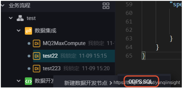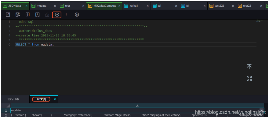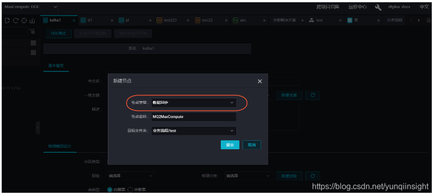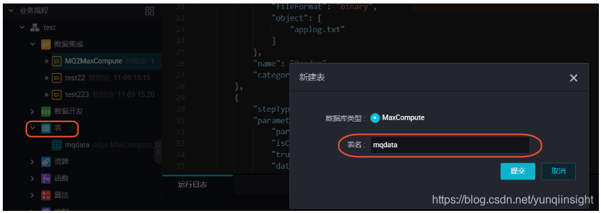 新建的同时,在DataWorks新建一个建表任务,用于存放JSON数据,本例中新建表名为mqdata。