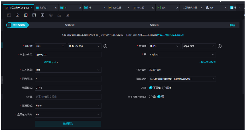 完成上述新建后,您可以在图形化界面配置数据同步任务参数,如下图所示。选择目标数据源名称为odps_first,选择目标表为刚建立的mqdata。数据来源类型为OSS,Object前缀可填写文件路径及名称。列分隔符使用TXT文件中不存在的字符即可,本文中使用 ^(对于OSS中的TXT格式数据源,Dataworks支持多字符分隔符,所以您可以使用例如 %&%#^$$^%这样很难出现的字符作为列分隔符,保证分割为一列)。