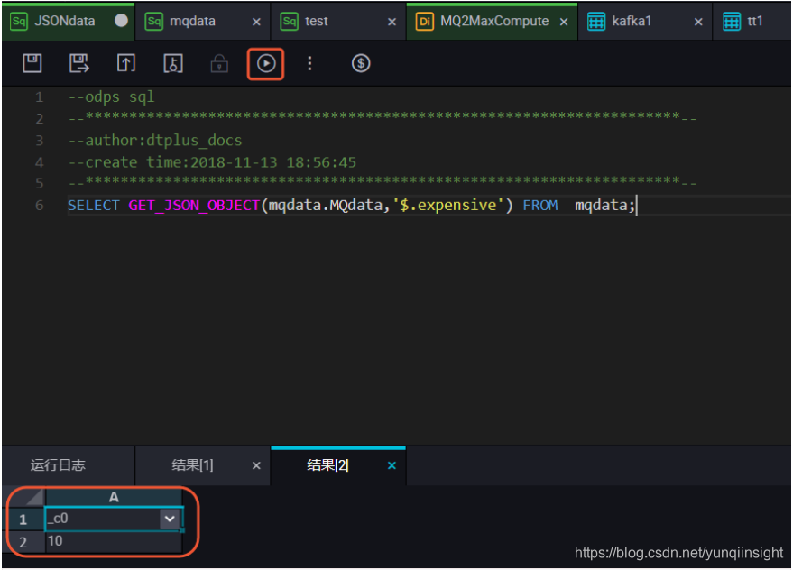 确认导入表中的数据结果无误后,您可以使用MaxCompute内建字符串函数GET_JSON_OBJECT获取您想要的JSON数据。本例中使用 SELECT GET_JSON_OBJECT(mqdata.MQdata,'$.expensive') FROM mqdata;获取JSON文件中的 expensive值。如下图所示,可以看到已成功获取数据。