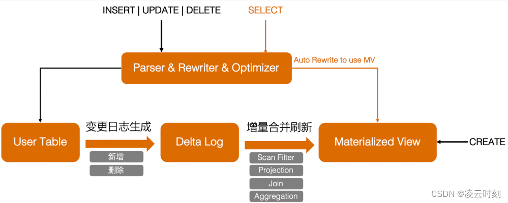 视图自动维护刷新:数据写入更新删除操作首先作用到 User Table 本身,同时生成对应的变更日志(包括新增数据和删除数据)同步到 Delta Log,增量合并刷新则读取 Delta Log,结合 MV 的具体定义,对每个支持的算子(包括过滤,投影,关联和聚集)应用增量合并刷新算法,更新物化视图内容。