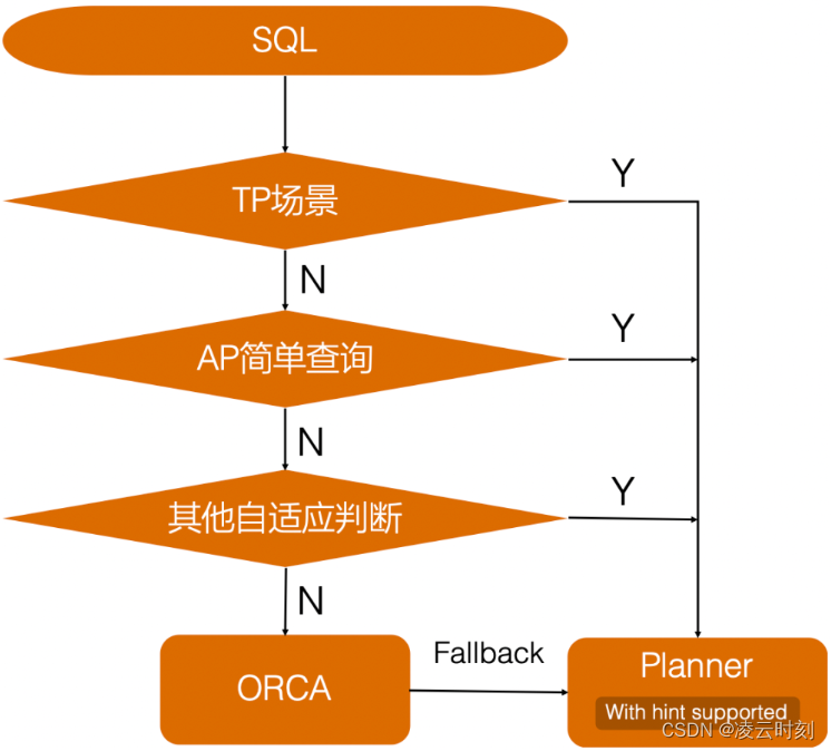 Planner 和 ORCA 本身各有优势且功能完备,能够覆盖 AP 和 TP 全场景,所以 ADB 并没有像执行和存储引擎那样新增自研优化器,而是在 SQL 解析和重写阶段根据 SQL 本身自动选择最优的优化器来生成执行计划,同时为Planner增加Plan Hint干预能力,可在少数场景人工干预局部调整执行计划。整体逻辑如下图: