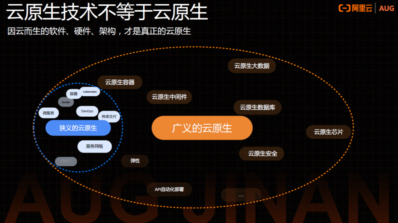云原生是一个更广义的概念,包含了刚才提到的这些云原生技术,也包含了像大数据、数据库、硬件、芯片等这些不断创新的领域。随着企业开始使用云原生技术,其实是云上整个技术栈在不断地做创新。