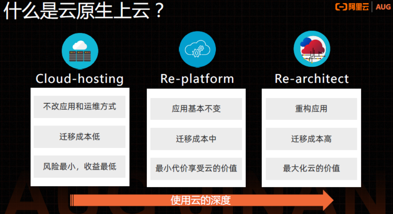 第二类:Re-platform。这种可能应用侧发生的变化是较为复杂的。我们希望通过一些云原生技术,像容器等,能够让用户更大利用云的价值,包括基于容器的弹性伸缩这样的技术会让用户迁移成本和得到价值之间有个比较好的平衡,因为它对业务一侧几乎是无感的,个别情况下会对业务进行一个容器化的变化,基本层面主要是运维一侧发生变化。