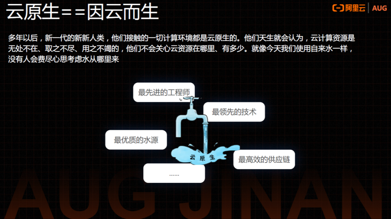 云原生==因云而生 云原生对于企业来说可能是幸运的,也可能是不幸运的。它是这几年里最大的变革,带来了从基础设施层面往上各层面技术的变革。我们可能是最后一代需要做云原生上云这件事情的人。展望下未来的几年时间里,所有新的应用都会是长在云生在云上的,这些应用在设计之初就会充分考虑怎么用云。