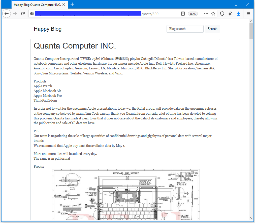 此次数据泄露的原因,起源于Quanta(广达电脑)被勒索攻击。广达电脑,总部位于中国台湾省,是世界有名笔记本代工大厂,也是苹果系列产品:Apple Watch,Apple Macbook Air和Apple Macbook Pro的制造商。因此是能够预先获得苹果产品设计和示意图的公司之一。