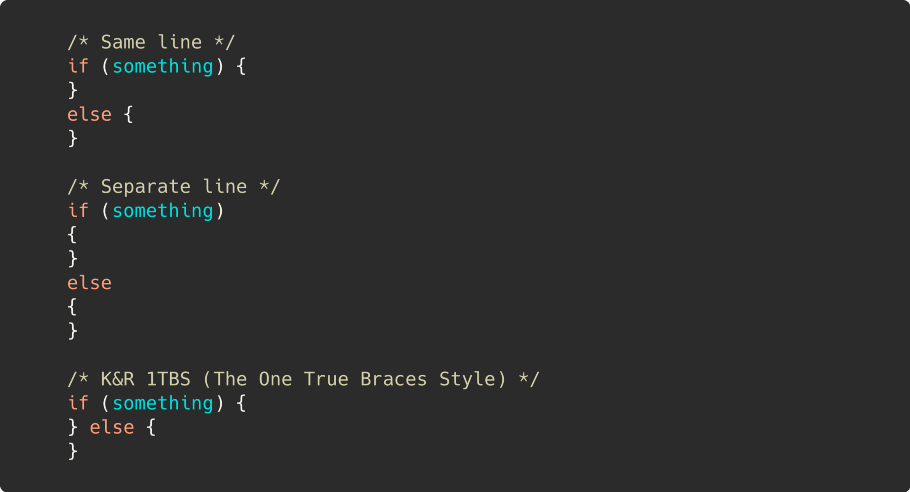 在没有注释的情况下,当接手别人的代码时,任何一个细节都可能激发开发者的厌恶情绪。包括一些大括号之类的小事,不论是放在同一行,单独成行,或K&R风格,都无法让所有人都满意。如果去 Google 一下关于大括号的争论,它的问题会让你越看越傻眼。