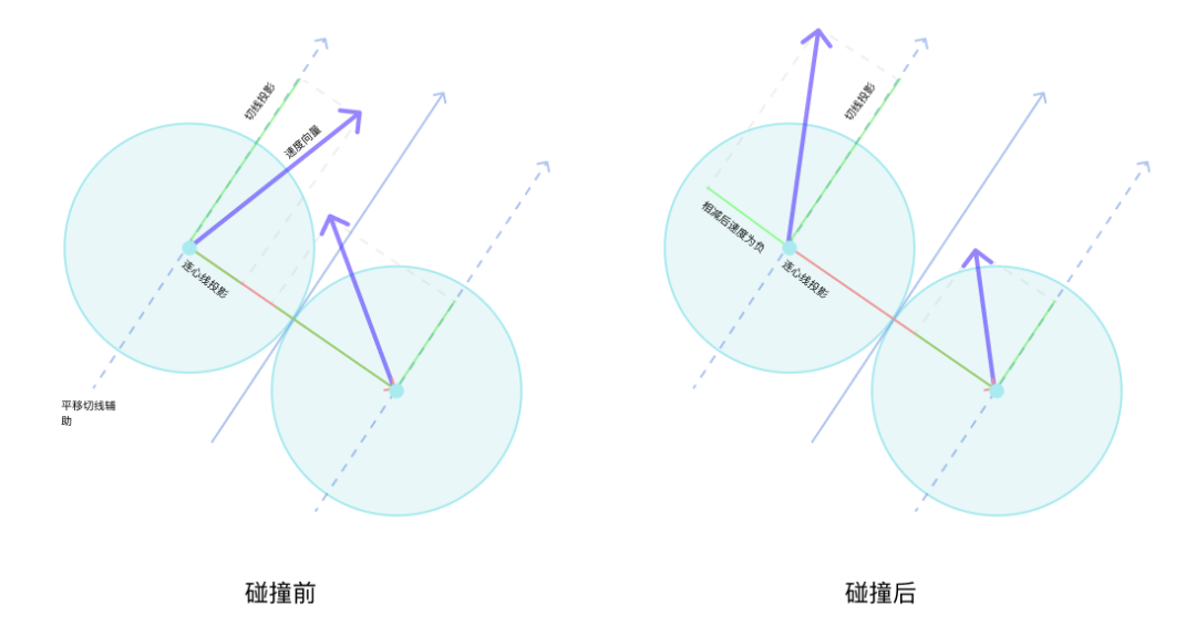 然后再给碰撞后的速度加上方向,计算在连心线方向和切线方向上的速度,只需要让速度标量跟连心线单位向量和切线单位向量相乘: