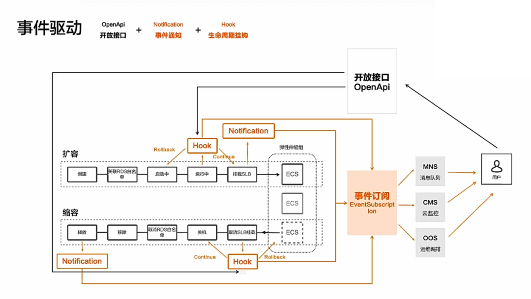 弹性伸缩提供的事件驱动能力,阿里在提供开放接口(OpenApi)的基础上又提供事件通知(Notification)和生命周期挂钩(Hook)的能力。通过这三种方式的结合可以让用户拥有更全面控制弹性伸缩组的能力。