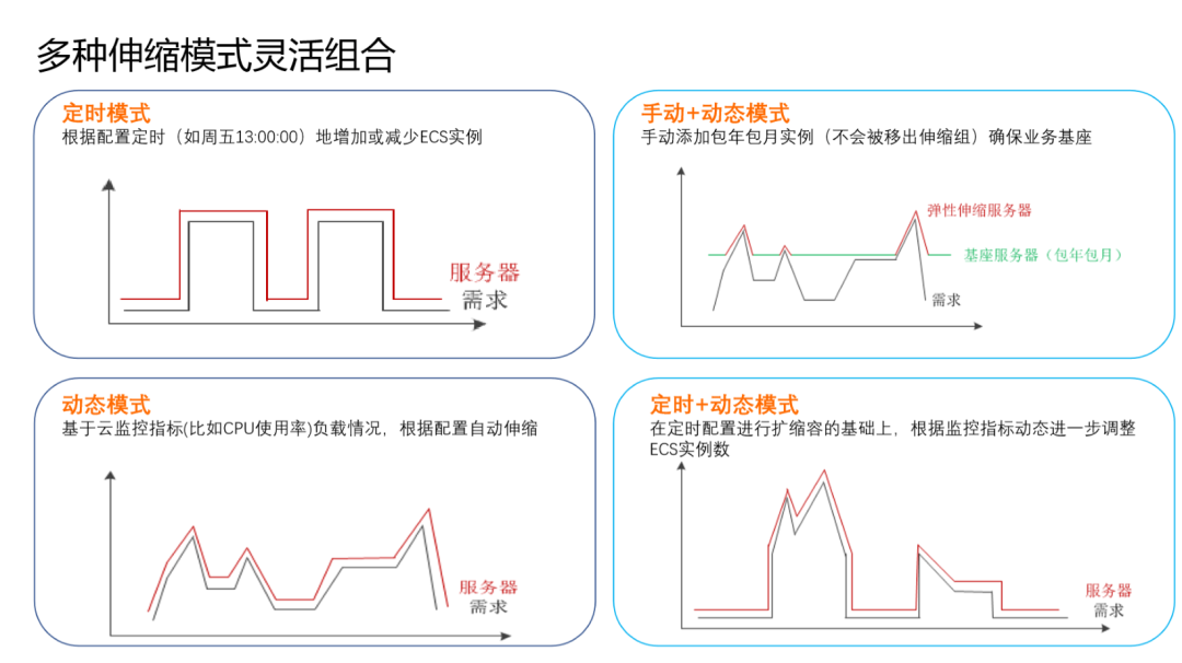 阿里云弹性计算提供不同的伸缩的规则,对应了不同的伸缩模式,包括: