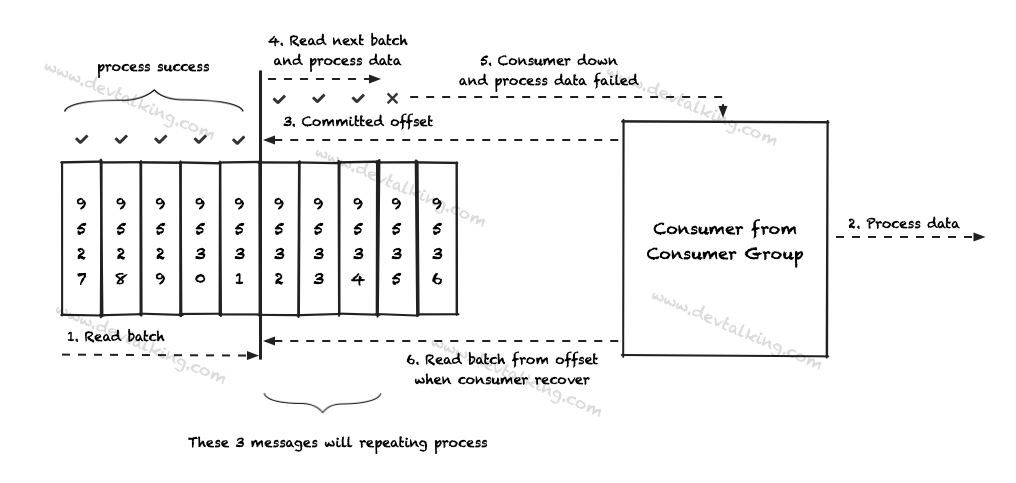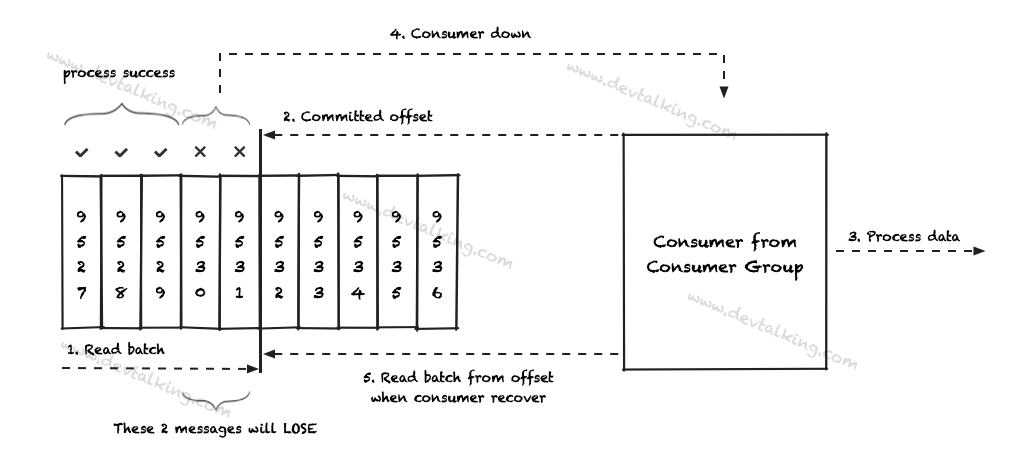 这种策略下,Consumer需要读到Message,并且正确处理了Message后,才会提交Offset。如果Consumer挂掉,再恢复后,可以重新读取上一次的Message继续处理。这里就需要我们处理Message的逻辑必须是幂等的,否则会造成Message重复执行导致错误的业务结果。整个过程如下图所示: