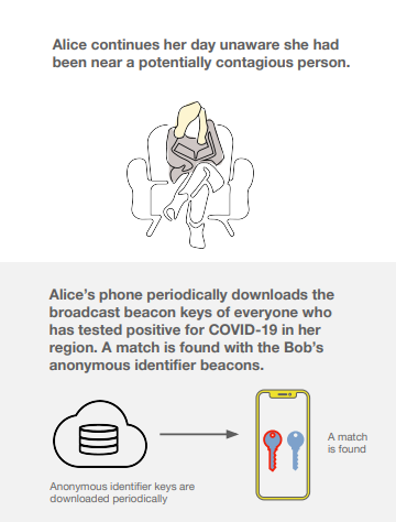 另一方面,同样使用了该技术的 Alice 会定期连上卫生当局的服务器去下载 COVID-19 确诊患者的 Beacon 秘钥。