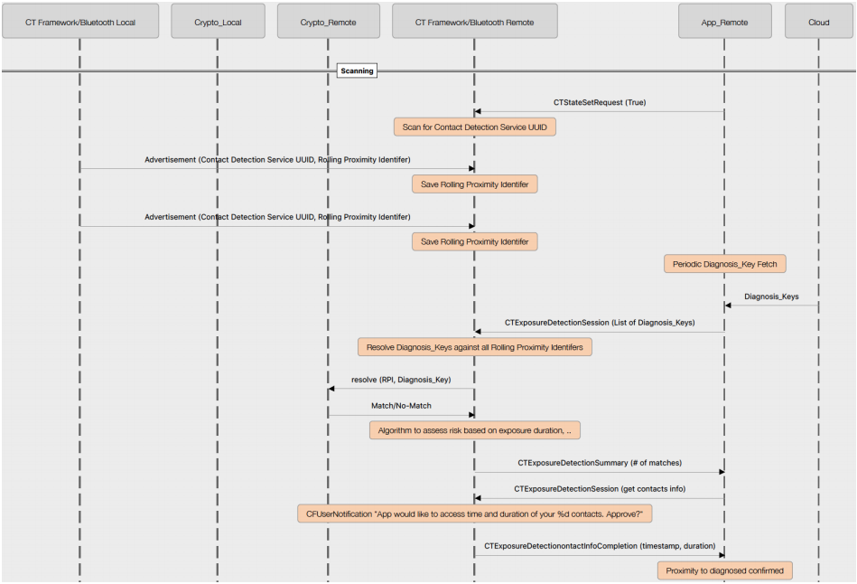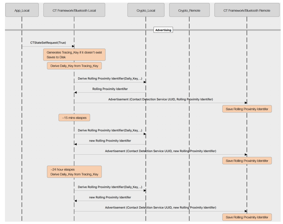 Contact Detection Service 的蓝牙 Service UUID 为 0xFD6F,在功能被激活后,蓝牙设备会持续广播带有该 Service UUID 的报文,同时也扫描带有该 Service UUID 的报文,并将其中所带的 RPI 给保存起来,为日后追踪比对使用。