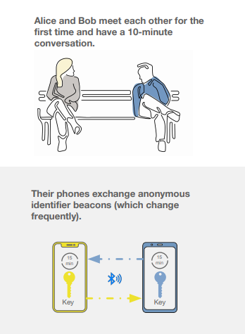 某一天下午, Alice 跟 Bob 做了近十分钟左右的短暂会谈,在他们聊天的过程中,彼此的手机蓝牙也在背地里交换了经隐私匿名处理的的蓝牙 beacon 信息并存储在手机中。