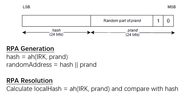 RAP 的格式为48 bits,其中 24 bits 为一随机数 prand,剩下的24 bits则是透过将 IRK 与 prand 作为蓝牙规格里定义的 ah 函数输入所产生的 hash 值。