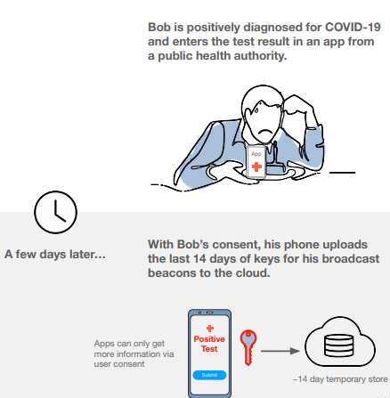 几天之后 Bob 确诊,他将确诊结果输入到卫生当局的 APP,并且同意将他过去14天用于产生匿名蓝牙 Beacon 的秘钥上传至云端,供其他用户下载进行比对。