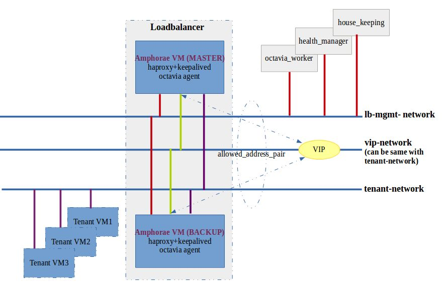 VIP:Virtual Load Balancer IP Address,与 Load Balancer 关联的虚拟 IP 地址,由运行在 Amphora 中的 Keepalived 来维护 VIP 的漂移和高可用性,遵守 VRRP 协议。