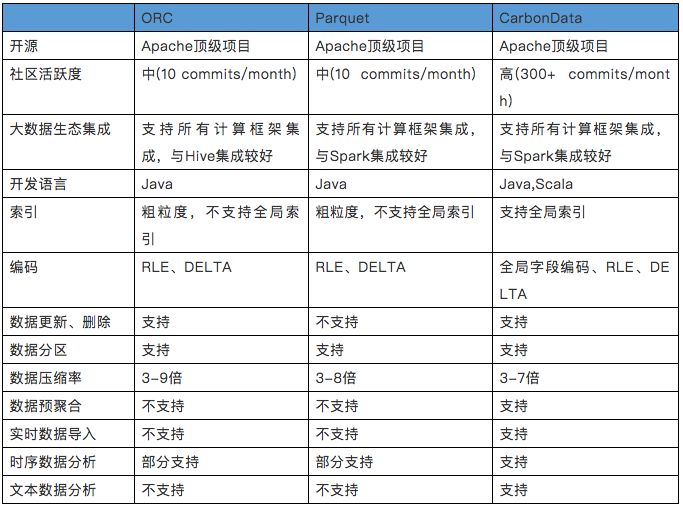4)总结分析 在过滤查询中,CarbonData的查询效率比parquet效率好,主要体现在列数据的索引查询,极大地提高了精确查询的性能。在聚合查询中,CarbonData通过使用全局字典编码来加快计算速度,这使得处理、查询引擎可以直接在编码好的数据上进行处理而不需要转换数据,数据只有在返回结果给用户的时候才转换成用户可读的形式,通过索引有效过滤文件数据块减少磁盘的IO,提高查询性能。三、小结 CarbonData在数据查询的性能表现比Parquet好很多,在写一次读多次的场景下非常适合使用;社区比较活跃,响应也很及时。目前官网发布版本1.3.0与最新的spark稳定版Spark2.2.1集成,增加了支持标准的Hive分区,支持流数据准实时入库等新特性,相信会有越来越多的项目会使用到。