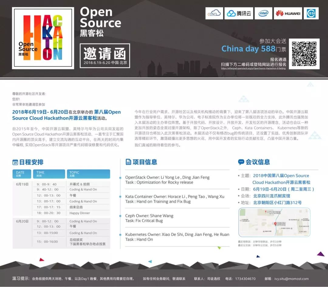 您好!非常荣幸地邀请您参加2018年6月19日 - 6月20日在北京举办的第八届Open Source Cloud Hackathon开源云黑客松活动。