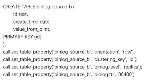 上图是一个例子,列出了如何使用Hologres的Binlog,这里是一个建表的DDL。