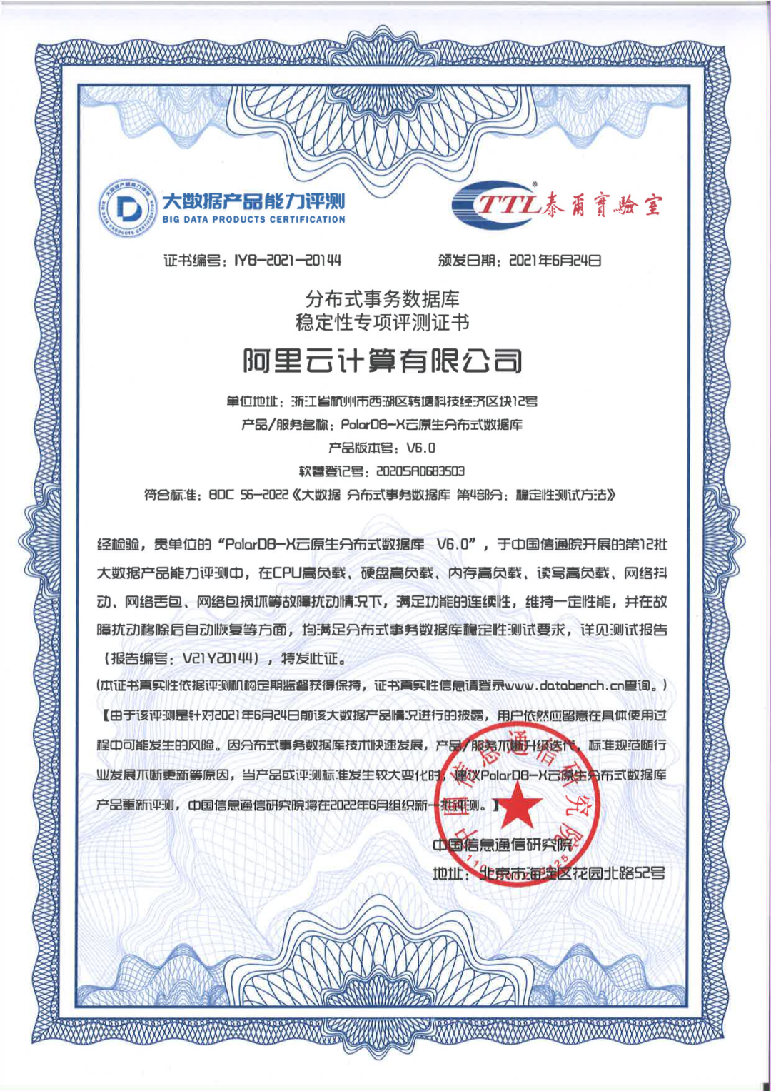 此外,阿里云PolarDB-X云原生分布式数据库也于近日完成了信通院主导的《分布式事务数据库稳定性专项评测》,高分通过全部测试项目。PolarDB-X 是由阿里自主研发的云原生分布式数据库,是一款基于云架构理念,并同时支持在线事务处理与在线分析处理 (Hybrid Transactional and Analytical Processing, HTAP)的融合型分布式数据库产品,具备金融级数据高可用、分布式水平扩展、混合负载、低成本存储和极致弹性等能力。