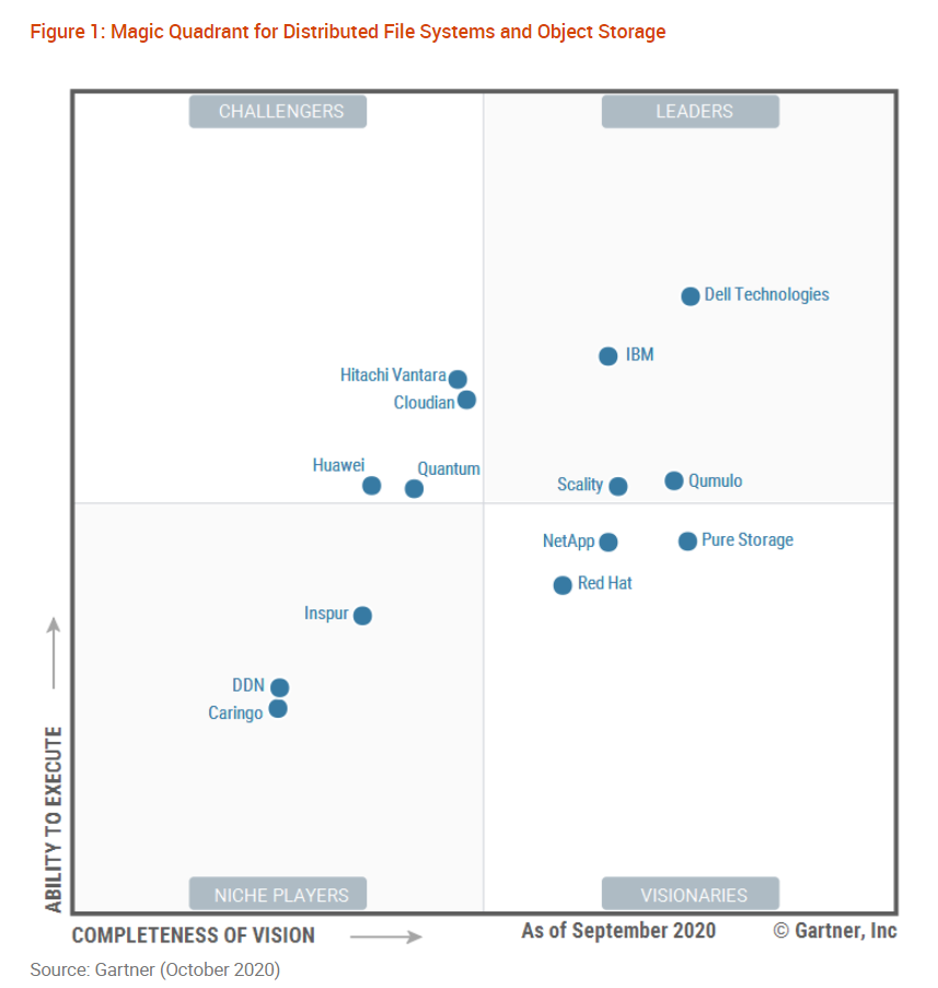 Gartner的《分布式文件系统和对象存储魔力象限图》指的是那些软硬件都采用分布式架构设计的存储系统,主要用于满足非结构化数据存储需求,好的架构设计都能避免单点故障和节点间资源争夺的问题。