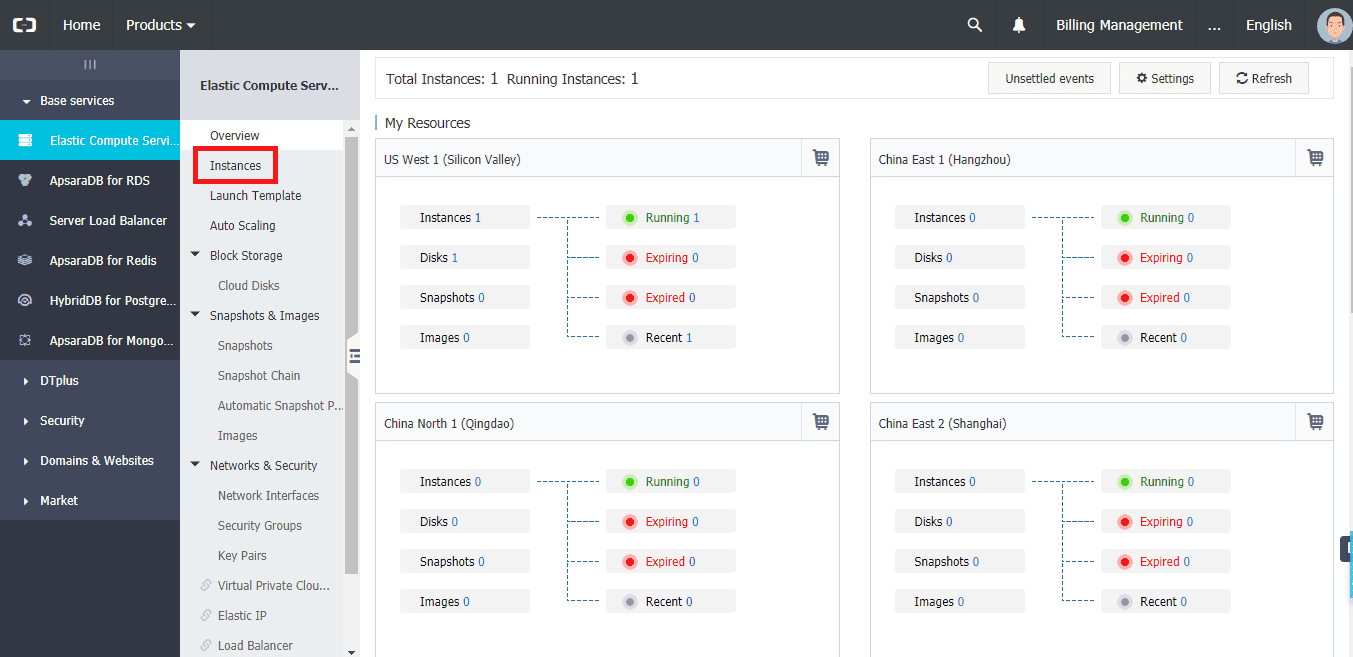 步骤 8.这将打开 ECS 控制台,您可以在其中看到当前实例的概览。单击左侧菜单上的实例。