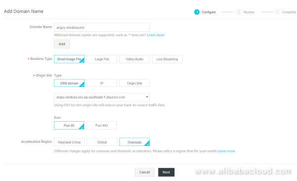 进入控制台,设置一个指向我们的OSS作为源站的CDN域名,并使用“海外”作为区域(中国和全球选项需要您获得ICP许可证):