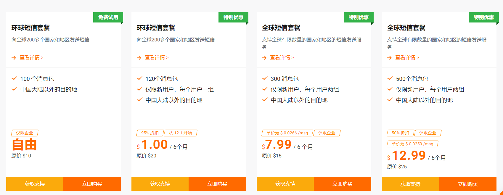 目前阿里云国际版有四种类型套餐进行选择,包含:环球短信套餐(小企业)环球短信套餐(中小型企业)全球短信套餐(中大型企业)全球短信套餐(大型企业),这其中的差别就在于消息包的数量不同,如果是初创企业建议选择环球套餐,后期综合根据自身的需要进行购买。