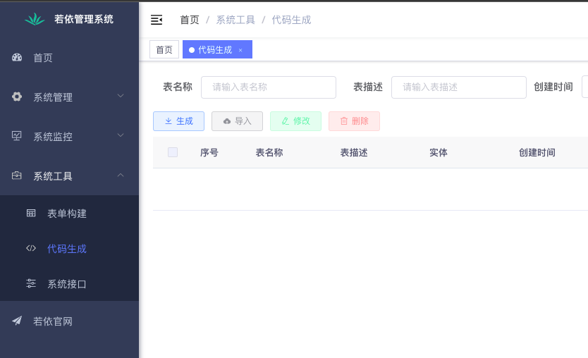 使用admin登录管理后台,菜单路径如下:首页/系统工具/代码生成