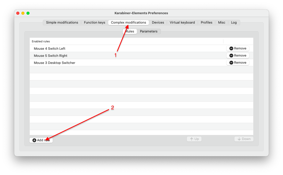 显然上面的单键映射无法满足我,我需要使用鼠标左侧的按键来切换虚拟桌面。如何实现呢?
