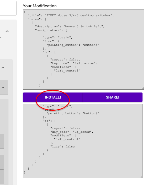 { "title": "ITKEY Mouse 3/4/5 desktop switcher", "rules": [ { "description": "Mouse 5 Switch Left", "manipulators": [ { "type": "basic", "from": { "pointing_button": "button5" }, "to": [ { "repeat": false, "key_code": "left_arrow", "modifiers": [ "left_control" ] } ] } ] }, { "description": "Mouse 4 Switch Right", "manipulators": [ { "type": "basic", "from": { "pointing_button": "button4" }, "to": [ { "repeat": false, "key_code": "right_arrow", "modifiers": [ "left_control" ] } ] } ] }, { "description": "Mouse 3 Desktop Switcher", "manipulators": [ { "type": "basic", "from": { "pointing_button": "button3" }, "to": [ { "repeat": false, "key_code": "up_arrow", "modifiers": [ "left_control" ], "lazy": false } ] } ] } ] }