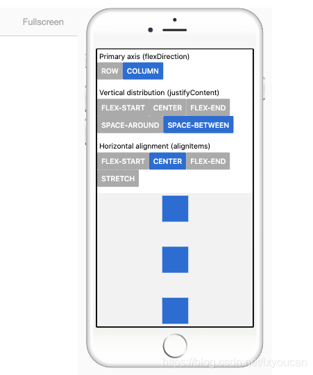 PropertyDefaultOptionsDescriptionflexDirectioncolumnrow, columnDo we want a vertical (column) or horizontal (row) layout? This choice determines the orientation of the primary axis of our layout.justifyContentflex-startflex-start, center, flex-end, space-around, space-betweenHow should the content be distributed along the primary axis of our layout? Should it be at the start, the center, the end, or spaced evenly?alignItemsstretchflex-start, center, flex-end, stretchHow should the content be aligned along the secondary axis of our layout? (If the primary axis is row, then the secondary axis is column, and vice versa) Should content be aligned at the start, the center, the end, or stretched to fill?