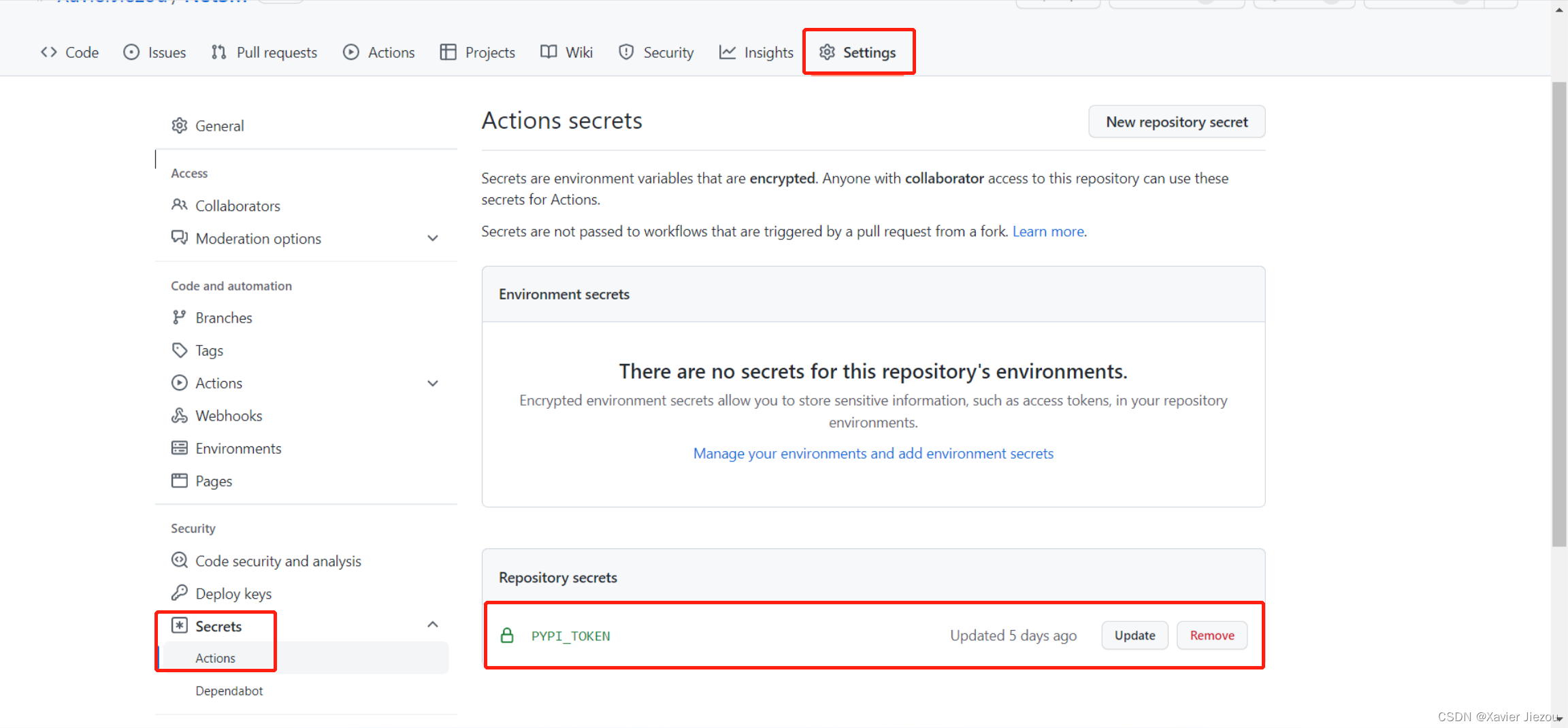并且,我已经将其添加到了仓库设置中的密钥设置里面了。