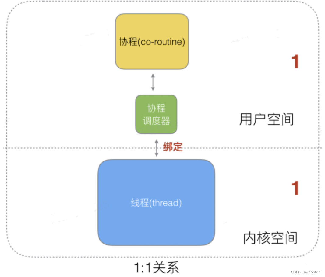 • 优点:1个协程绑定1个线程,这种最容易实现,协程的调度都由CPU完成了。