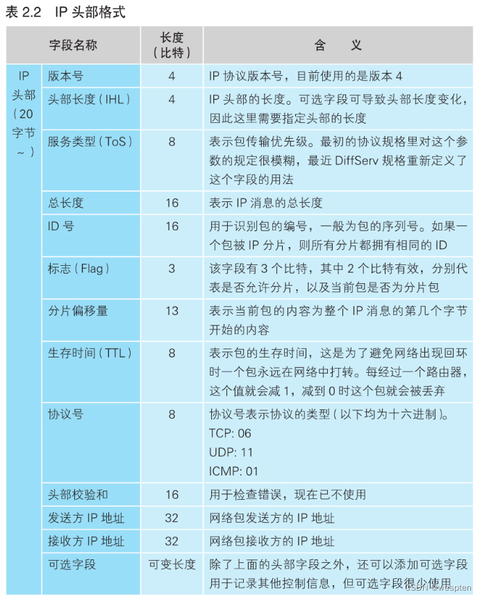 IP 头部包含的内容如表 2.2 所示,其中最重要的内容就是 IP 地址,它表示这个包应该发到哪里去。