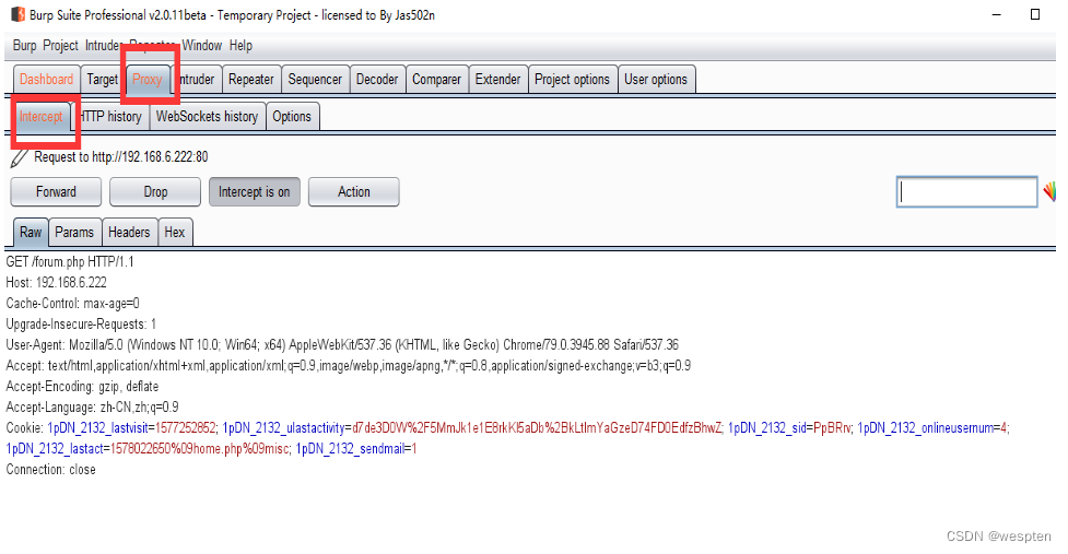 3. 设置好之后,就可以开始抓包了。在burpsuite中的Proxy中的Intercept中进行抓包。