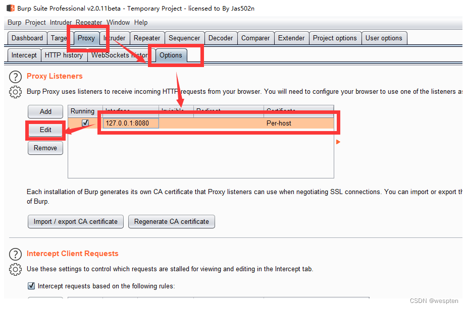 1. 打开burpsuite工具,在proxy中的Option下,看到对应的Interface为127.0.0.1:8080。