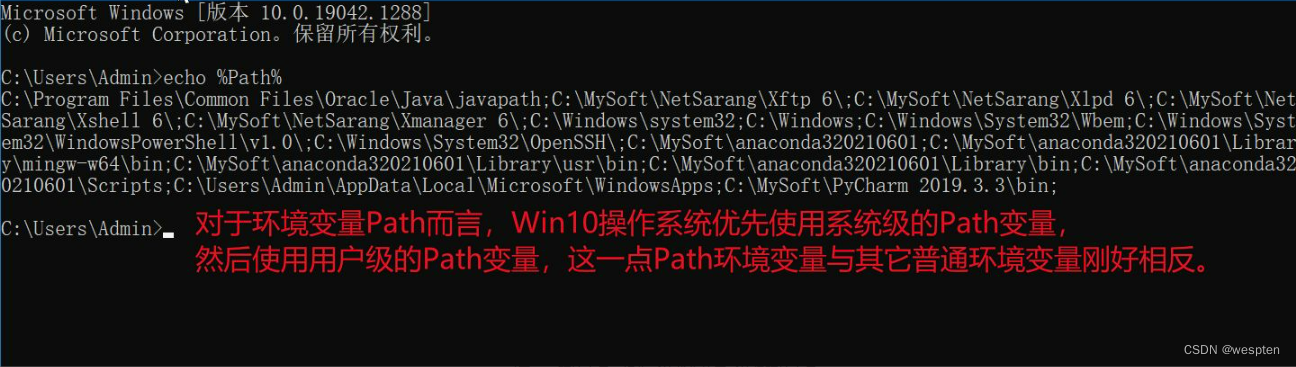 对于Path环境变量,Win10操作系统是将用户级的Path环境变量追加到系统级的Path环境变量的后面。因为Windows操作系统在查找指令的时候,是按照Path环境变量中的路径从前往后查找,直到在某个路径下找到了目标指令,因此,如果系统级Path环境变量中有目标指令,则Windows不会再去用户级Path环境变量中查找目标指令,这一点Path环境变量与其它普通环境变量刚好相反。