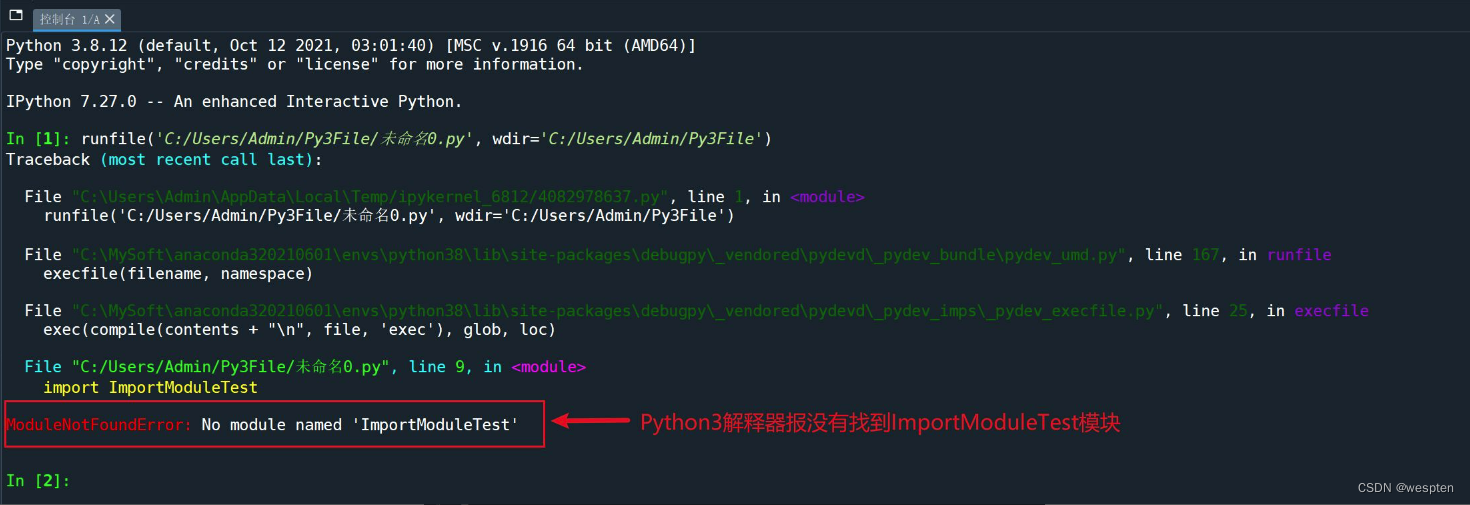 当我们没有将文件夹D:\AnZe\DyPy3Module动态添加到Python3解释器的模块查找路径中之前,如果导入ImportModuleTest.py模块,则程序运行之后将得到如下图11所示的结果,可以从图11中发现import ImportModuleTest模块失败。
