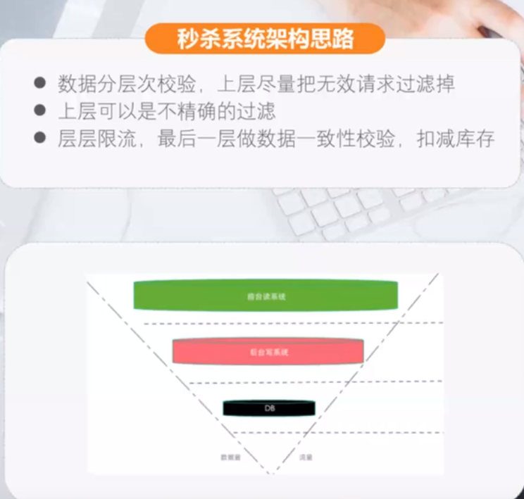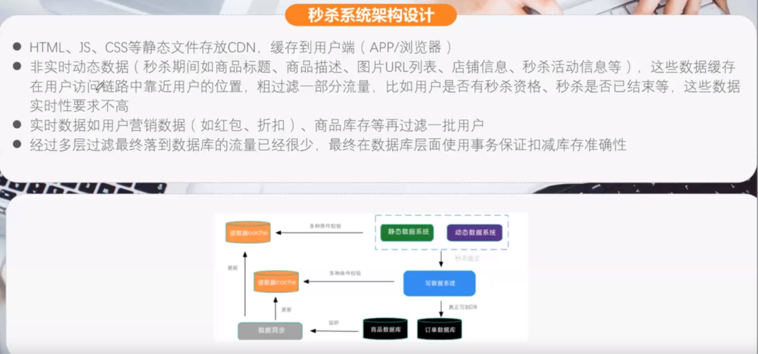 秒杀系统库存数据在缓存中,逻辑层会与cache交互获取库存,如果还剩余的话,可以访问数据库减库存。
