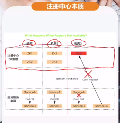 因为zk是cp模型,一旦网络划分就从整个集群不可用了,有一个节点连不上整个服务节点就不可用了。