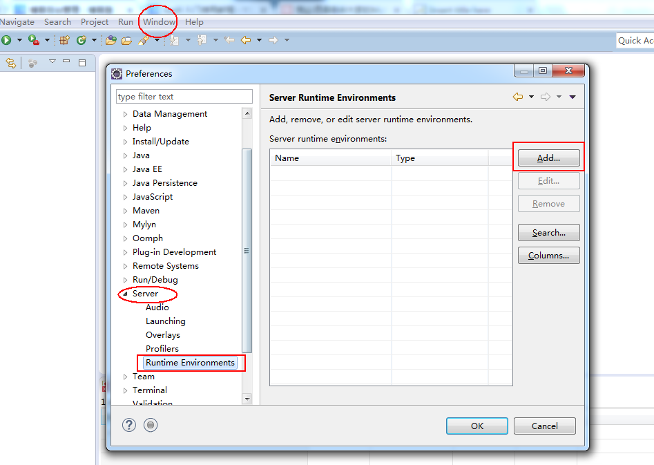 1、在 eclipse 中,选择 Window--->Preferences--->Server--->Runtime Environments,选择 Add 按钮