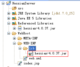 新建一个名为HessianServer的web project。将hessian-4.0.37.jar放入WEB-INF/lib文件夹中,如下图所示: