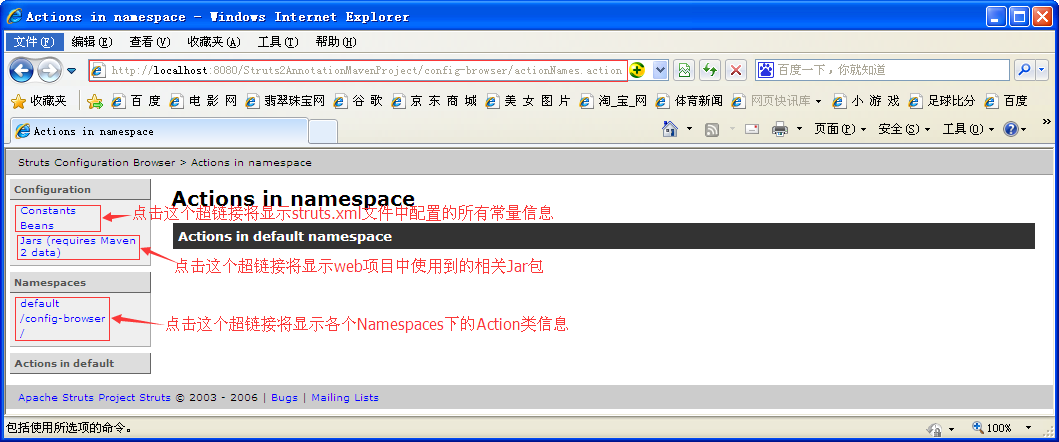 输入访问URL:http://localhost:8080/项目名/config-browser/index.action来访问config-browser-plugin插件提供的视图页面,例如:http://localhost:8080/Struts2AnnotationMavenProject/config-browser/index.action,这样就可以进入config-browser-plugin插件提供的视图界面,如下图所示: